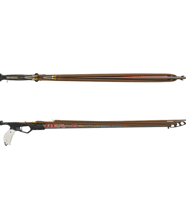 Invictus handled speargun. Trigger mechanism made entirely of stainless steel with elongated lever that maximizes its sensitivity. Aluminum cylindrical barrel featuring muliticolored camouflage. 3-hole open muzzle. Equipped with Performer 2 rubber bands with Dyneema wishbones, and barbed shaft.